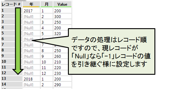 「年」レコードの現在の処理位置が「Null」であれば、一つ前のレコードの値(「-1」レコードの値)を参照していけば問題なさそうです。