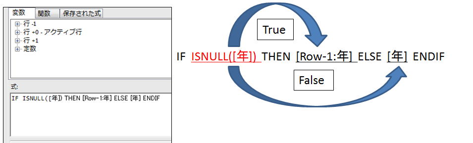 式の内容としては、条件分岐(IF文)を使います。値が「Null」かどうかで分岐しますのでIsNull関数を使い、データがNullかどうか判断します。Nullであれば「-1」レコードの「年」フィールドの値を参照し、Nullでなければ現レコードの「年」フィールドを参照するように設定します。