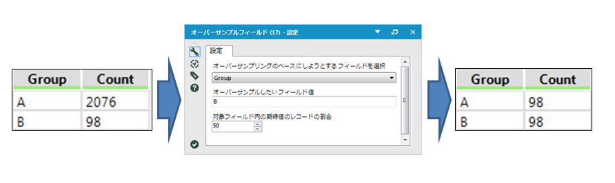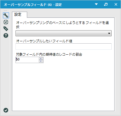 設定項目としては、オーバーサンプルしたいグループが入っているフィールド名、オーバーサンプルしたいグループ、そして、対象となるグループのレコードの割合を指定します。