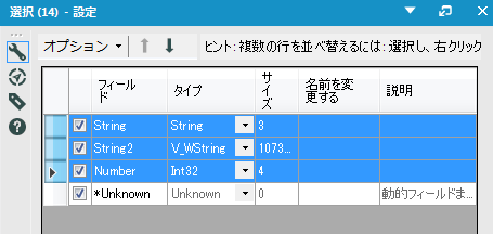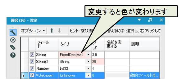 タイプの選択で「Int16:強制」など強制が付加されている選択肢が存在します。Alteryxでは接続されたデータの型式を自動判別する機能があります。大抵は問題ありませんが、データソースを変更した場合などに、数値だったものが文字列と認識され以後の処理がエラーになってしまう場合があります。そのような場合には「強制」を選択すると、データソースが変更されてもそのフィールドは選択されたタイプとなります。