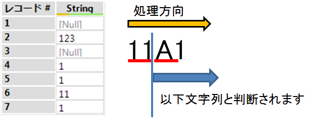 文字と数字が混在する場合は左から処理されますが、文字があった場合はその場所以降は文字列と判断されます。よって「A1」は「Null」となりますが「1A」は「1」となります。