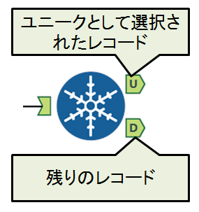 指定したデータフィールドでグループ化を行い、各グループの最初のレコードをユニークレコードとして「U」から出力します。「D」から残りのレコードが出力されます。