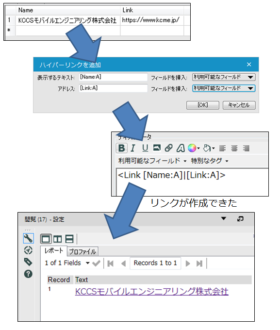 ハイパーリンクを作成する場合は「ハイパーリンクを追加」ウィンドウにてアドレスなどを入力またはフィールドを選択します。