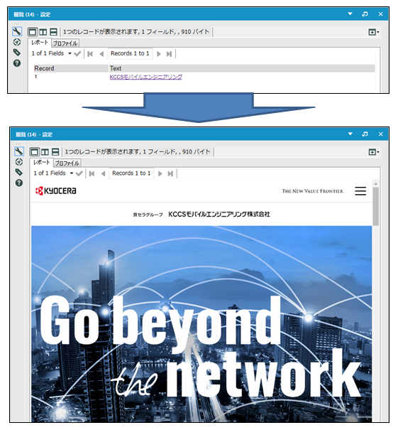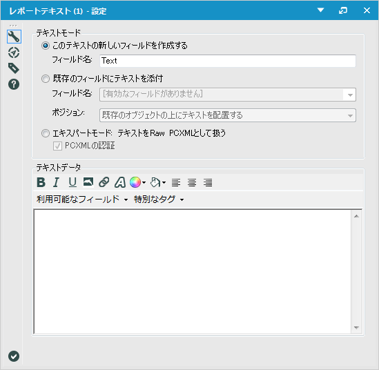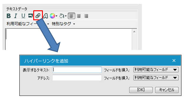 テキストデータ領域には、テキスト本文の記載、上位ツールからのデータフィールドを利用してテキストを作成することができます。また、ハイパーリンクを使ってエキスパートモード以外でもWEBリンクなどの作成が可能です。
