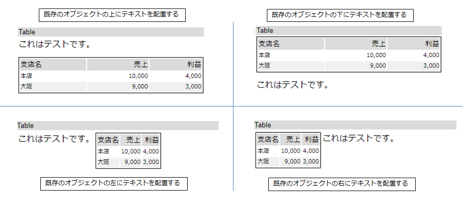 既存の表やグラフなどのオブジェクトにテキストを追加します。テキスト配置位置を上下左右から選択できます。
