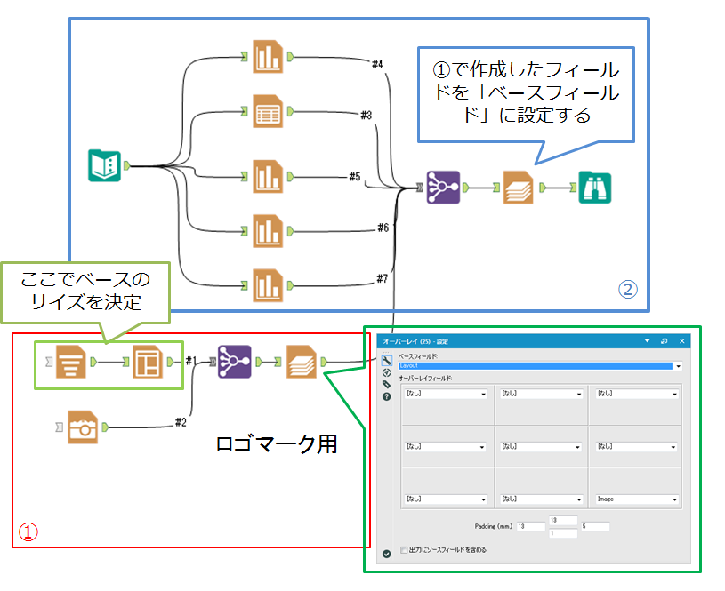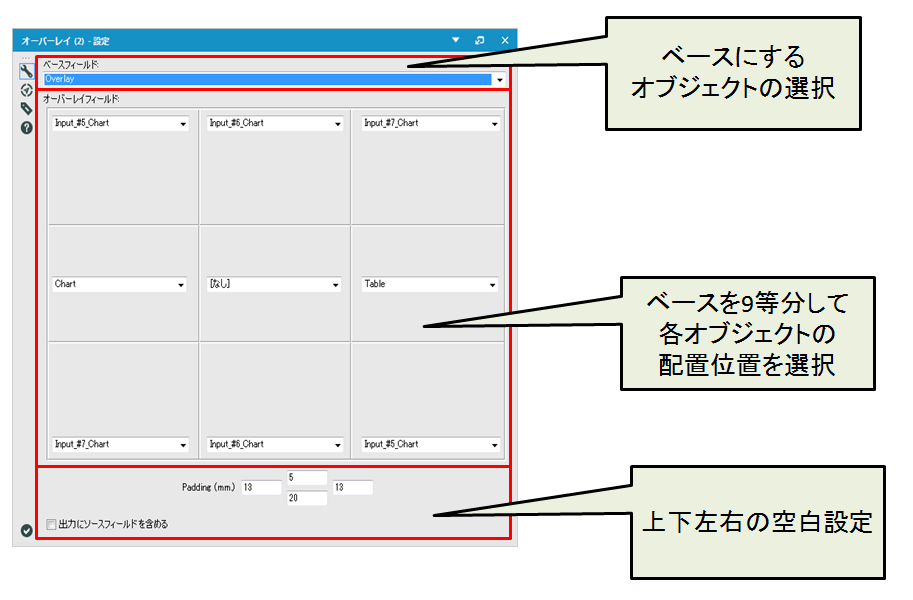 | ベースフィールド | ベースとなるオブジェクトを選択します。オーバーレイ出力されるオブジェクトのサイズはベースオブジェクトの大きさとなります。 |