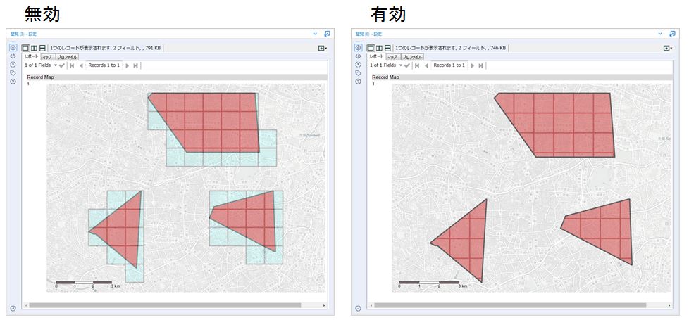 対象の空間オブジェクトを個別に内包できる様に、グリッドを生成します。「全レイヤーの単一グリッドを生成する」と異なり空間オブジェクトの形に即したグリッドを生成します。