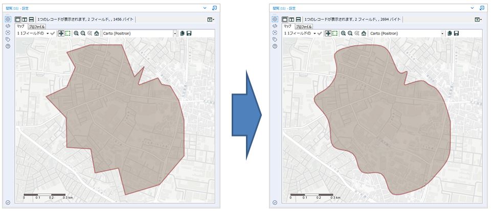 このツールは空間オブジェクトをBスプライン曲線で近似し、なめらかな空間オブジェクトを生成するツールです。ノードを追加して滑らかにするため、ポイント数が増えます(データ量が増えます)。