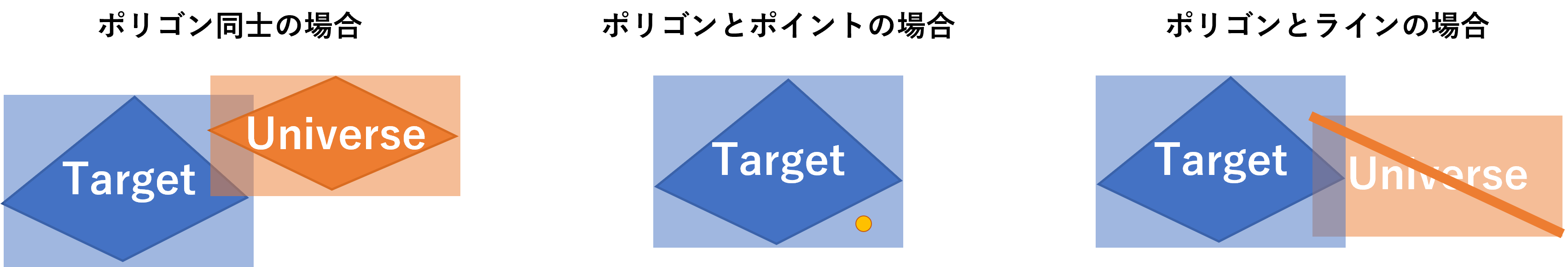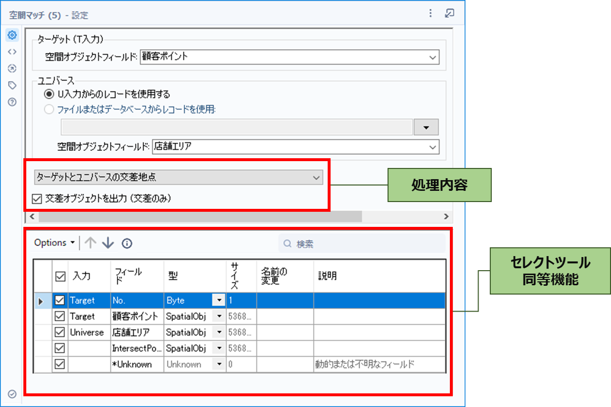 | 交差オブジェクトを出力 | 処理内容を「ターゲットとユニバースの交差地点」を選択した時のみ設定が可能で、チェックを入れると交差オブジェクトを「Intersect Poly」という名称のフィールドに出力します。