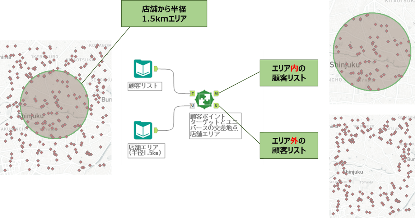 例えば、顧客の住所リストとある店舗から半径1.5kmの円のエリアがあるとします。この店舗から1.5km以内の顧客を探したい、といった際は以下のようになります。