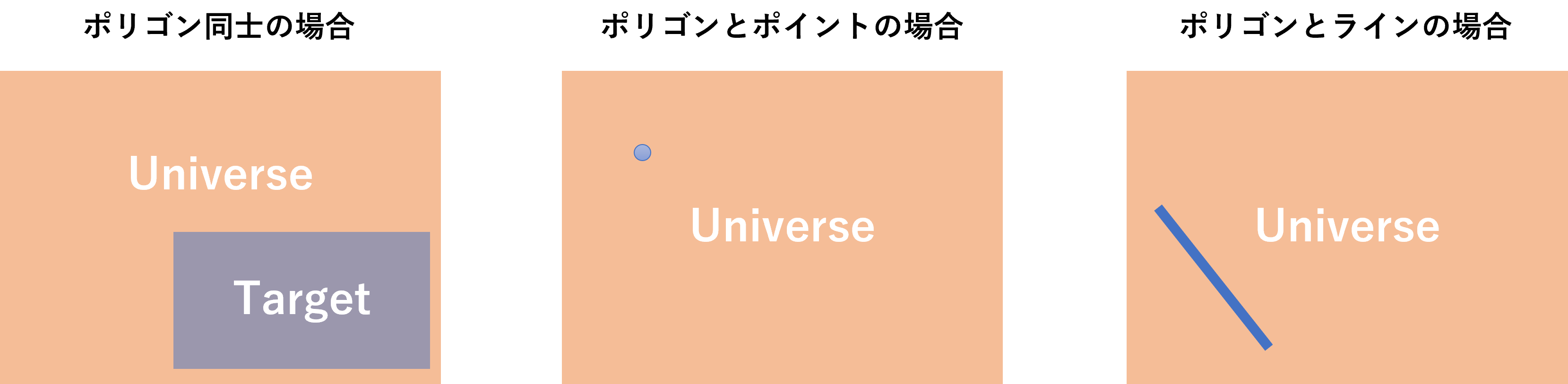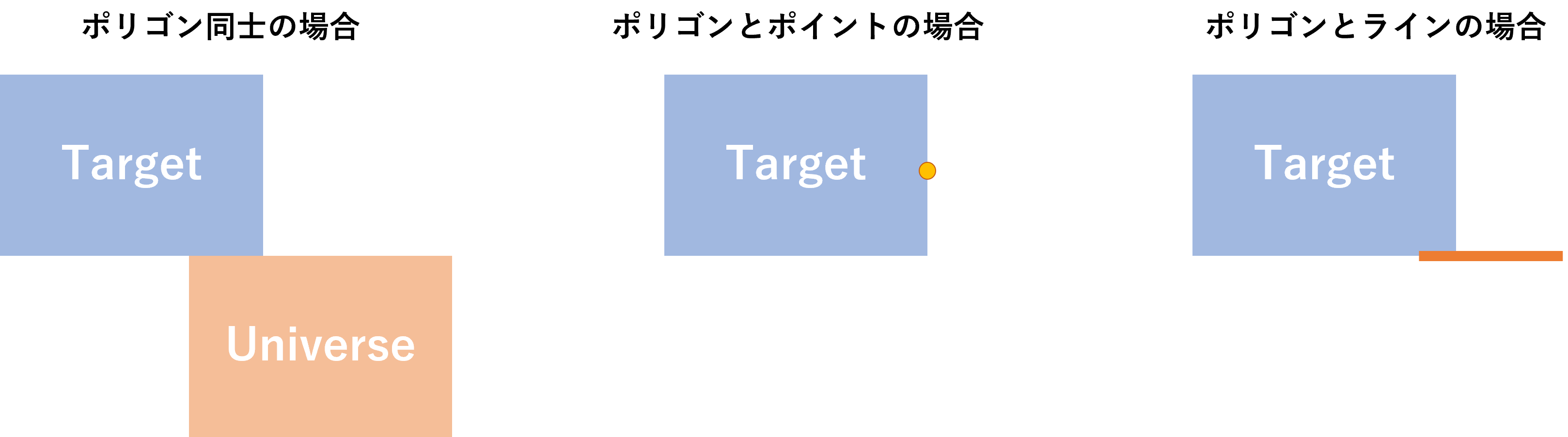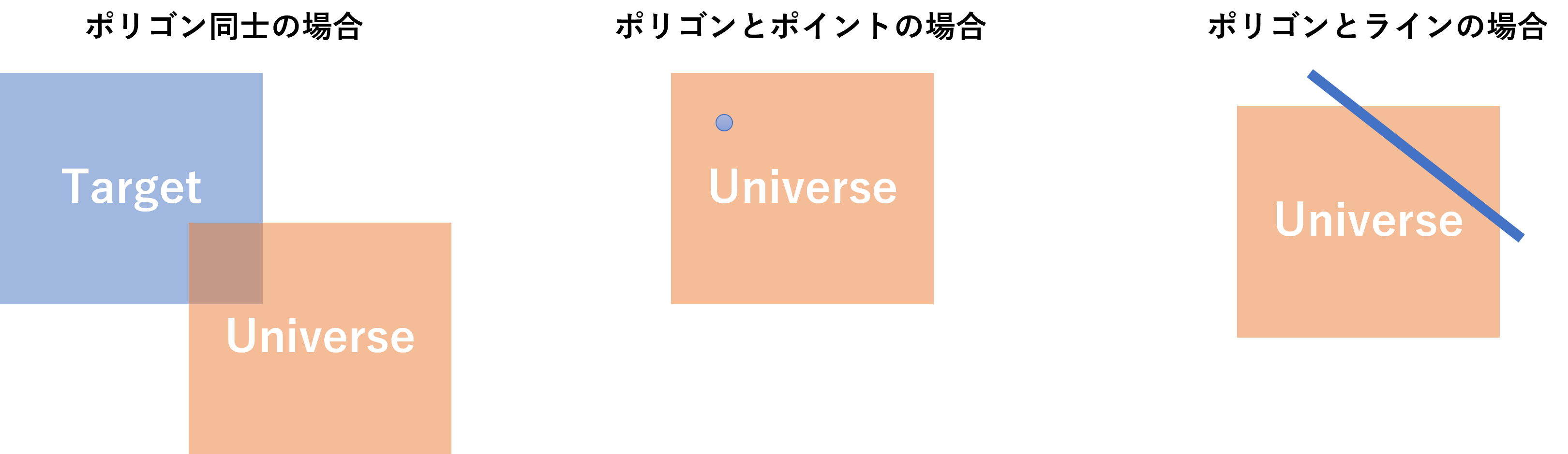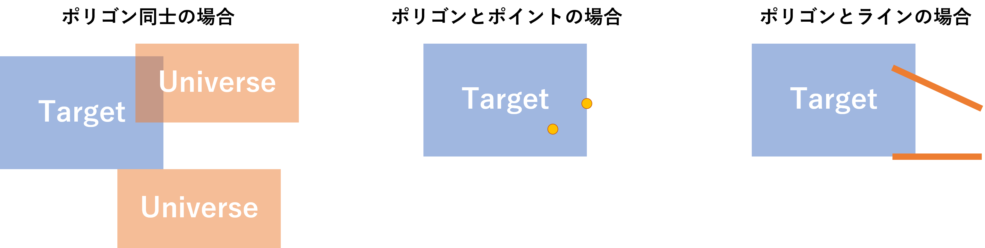 - ターゲットとユニバースの接触または交差地点(touches or intersects)