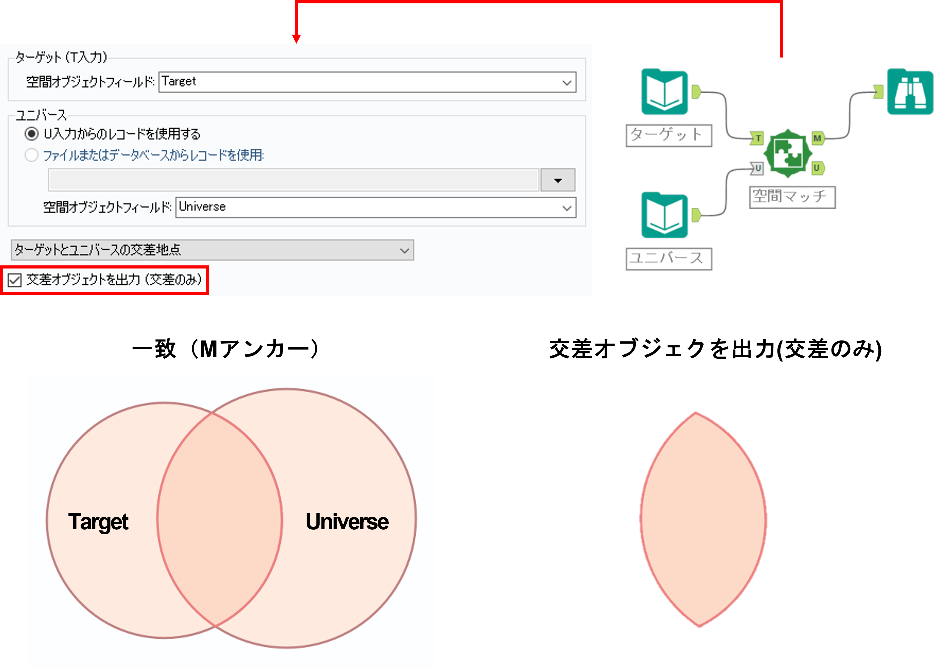 出力のM出力(マッチ)、U出力(アンマッチ)はターゲットのレコードのうちマッチしたもの、マッチしていないものを出力します(ユニバース側の入力は、M出力側に出てきますが、条件に合うターゲットが複数存在する場合は複数回出力されます)。
