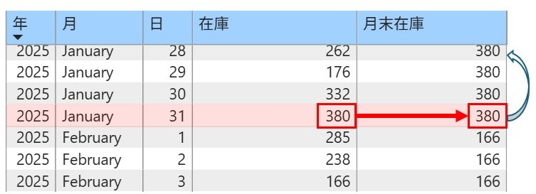 このメジャーを、表(Table) で「日付」を軸に置いて表示すると、各月の最終日の値が出力される。