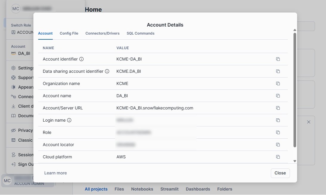 先ほどコピーしたアカウントURLをServer欄に入力し、処理に使うウェアハウスをWarehouse欄に入力します。