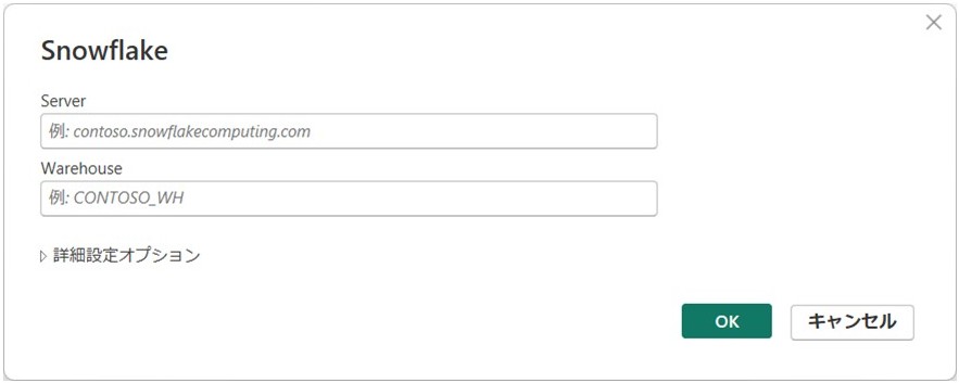 Power BI DesktopのSnowflakeコネクションを選択するとアカウントURLとウェアハウスの情報が必要です。