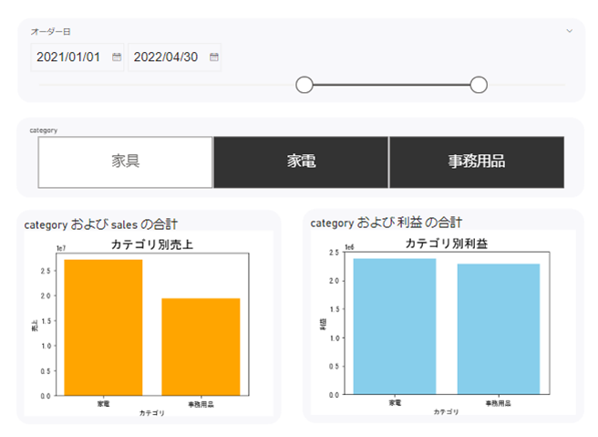 次のようにコードを入力し、カテゴリ別売上縦棒グラフを出力します。