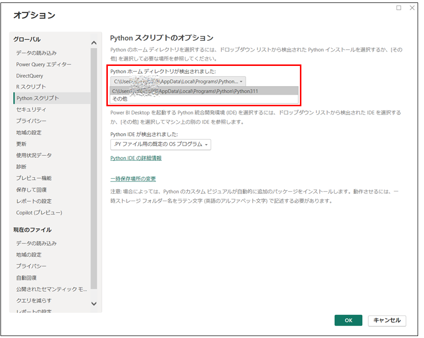 Power BI DesktopオプションのPythonスクリプトでPythonがインストールされたディレクトリを選択します。