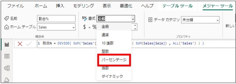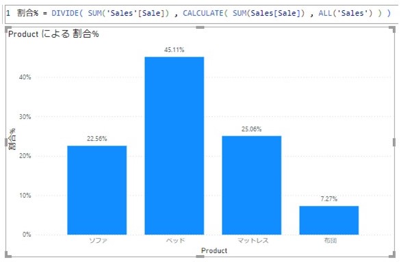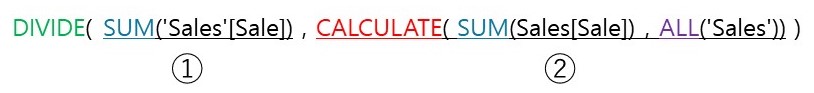 割合% = DIVIDE( SUM('Sales'[Sale]) , CALCULATE( SUM(Sales[Sale]) , ALL('Sales') ) )