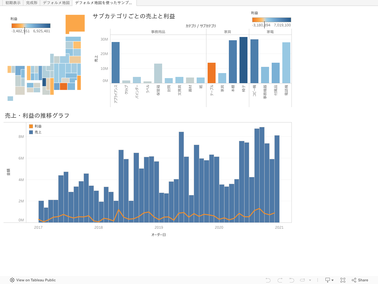 以下、Tableau Publicにアップロードしたサンプルダッシュボードです。自由に触ったりダウンロードできますので、御覧ください。