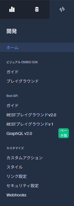 開発者メニューは、以前のメニューとあまり大きな変化はありません。組み込み開発、APIのメニューを中心にメニューが配置されています。
