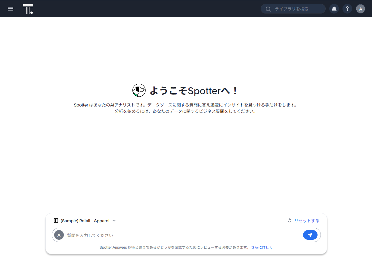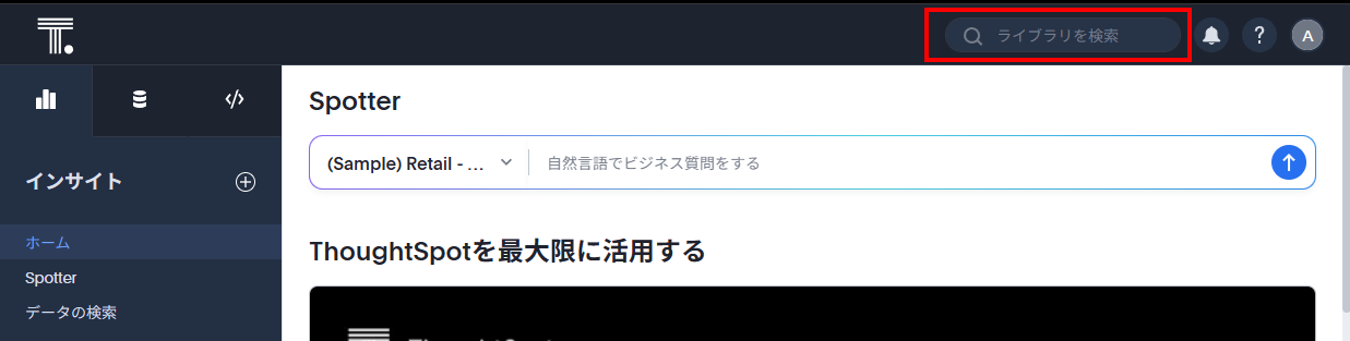 基本的に、最初にThoughtSpotしたときに見る画面は「インサイト」タブの「ホーム」です。同列のメニューとして、Spotter、データの検索(Search)が用意されています。
