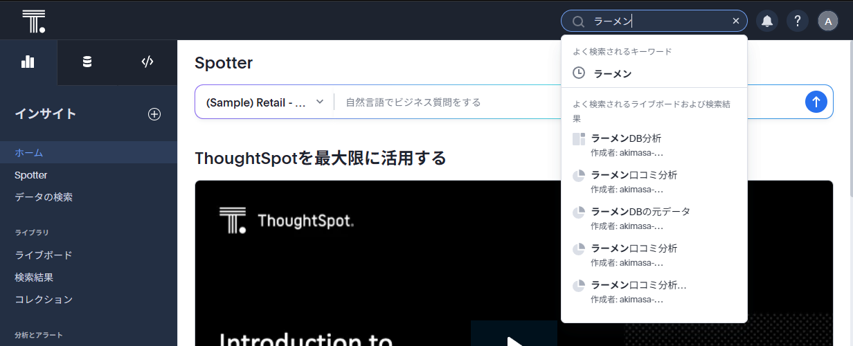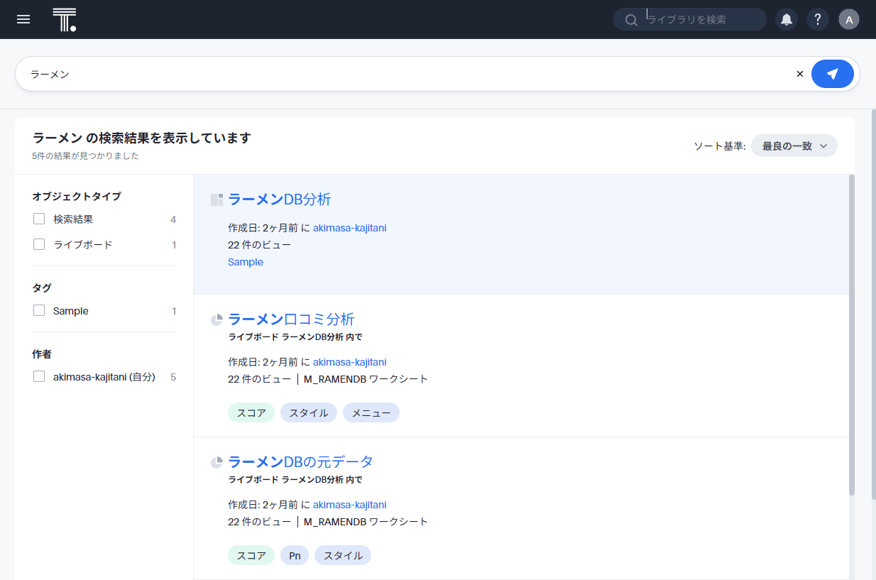 例えば・・・昔作ったラーメンDBの分析のライブボードが見たい、とします。「ラーメン」と「ライブラリを検索」に打ち込んでみると、よく使われる関連キーワードなどがポップアップします。