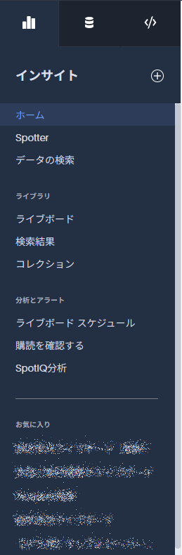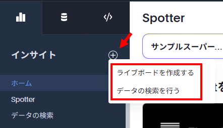 インサイトは、データを見るための機能を集約しています。検索を行ったりライブボードの閲覧や作成、Spotterを使用することができます。