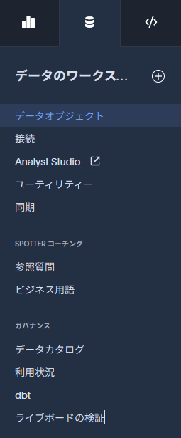 データワークスペースは、データウェアハウスへの接続設定を行ったり、接続したデータのモデルを作成するような機能にアクセスが可能です。