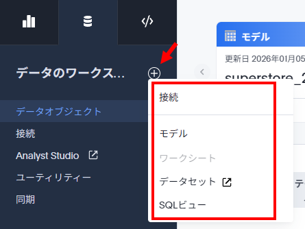 データワークスペースではよく使う機能として「+」ボタンが用意されており、ここをクリックすると、以下のように「接続」「モデル」「データセット」「SQLビュー」といったメニューを呼び出すことができます。