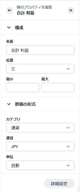 「Y軸のプロパティ」設定は、軸の名称、位置、範囲(最小、最大)、数値の形式を設定可能です。