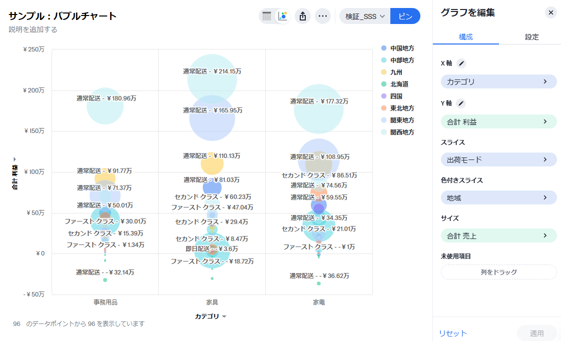 以下の例は、とりあえず全項目が埋まるように作成したため見やすさはいかがなものか、というのはありますが、X軸はカテゴリ、Y軸は利益、サイズは売上、スライスは出荷モード、色付きスライスは地域としています。これによって、利益が赤字の地域/出荷モードは下の方に表示されつつ、売上が大きければバブルのサイズが大きい、といった表現が可能です。