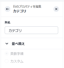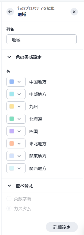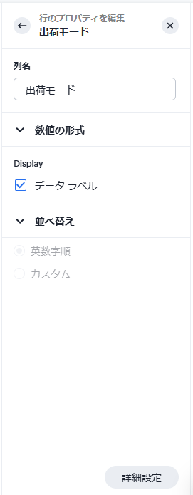 「スライスの行のプロパティ」の設定は、列名、データラベル、並べ替えの設定が可能です。
