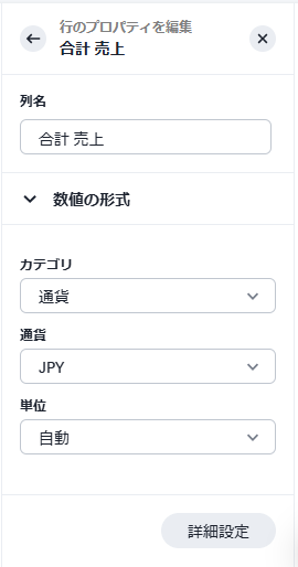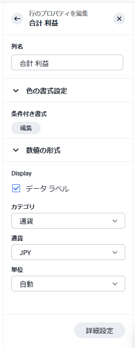 「Y軸の行のプロパティ」の設定は列名の変更、条件付き書式、数値の形式設定が可能です(標準的な数値用の設定ですね)。
