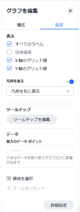 バブルチャートのカスタマイズ項目は、「すべてのラベル」「X/Y軸のグリッド線」「凡例表示」「ツールチップ」となります。回帰直線は利用できません。