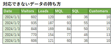 つまり、以下のように表示したい数値項目が異なるフィールドにある場合はThoughtSpotのじょうごグラフでは扱うことができません。