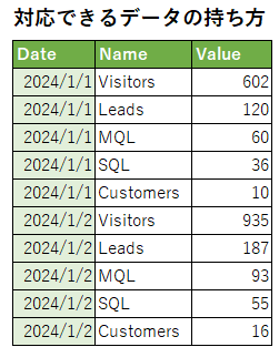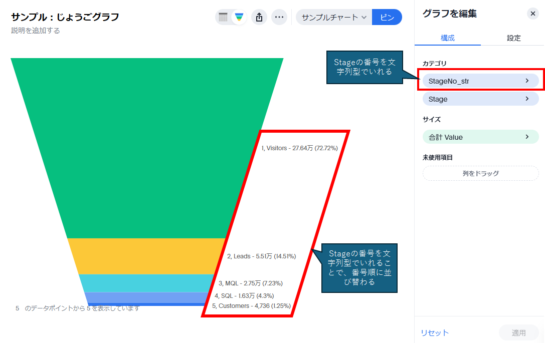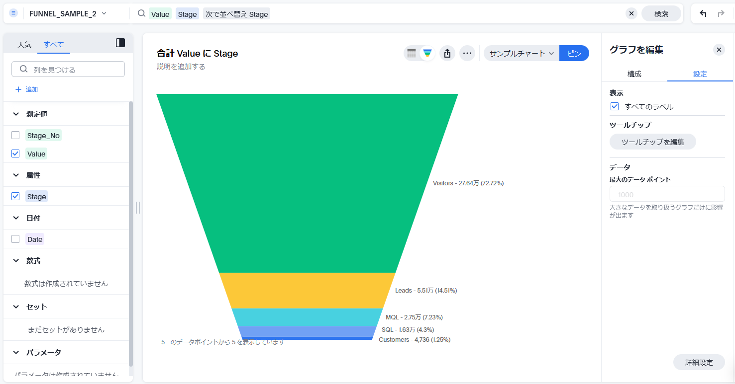 じょうごグラフの表示には、最低1つの属性(ディメンション)と1つの数値が必要となります。属性は複数追加可能ですが、カンマ区切りとなります。数値は属性によって分割されている必要があり、もし数値が異なるカラムに格納されている場合は、一つのカラムに集約する(データを縦持ちにする)必要があります。
