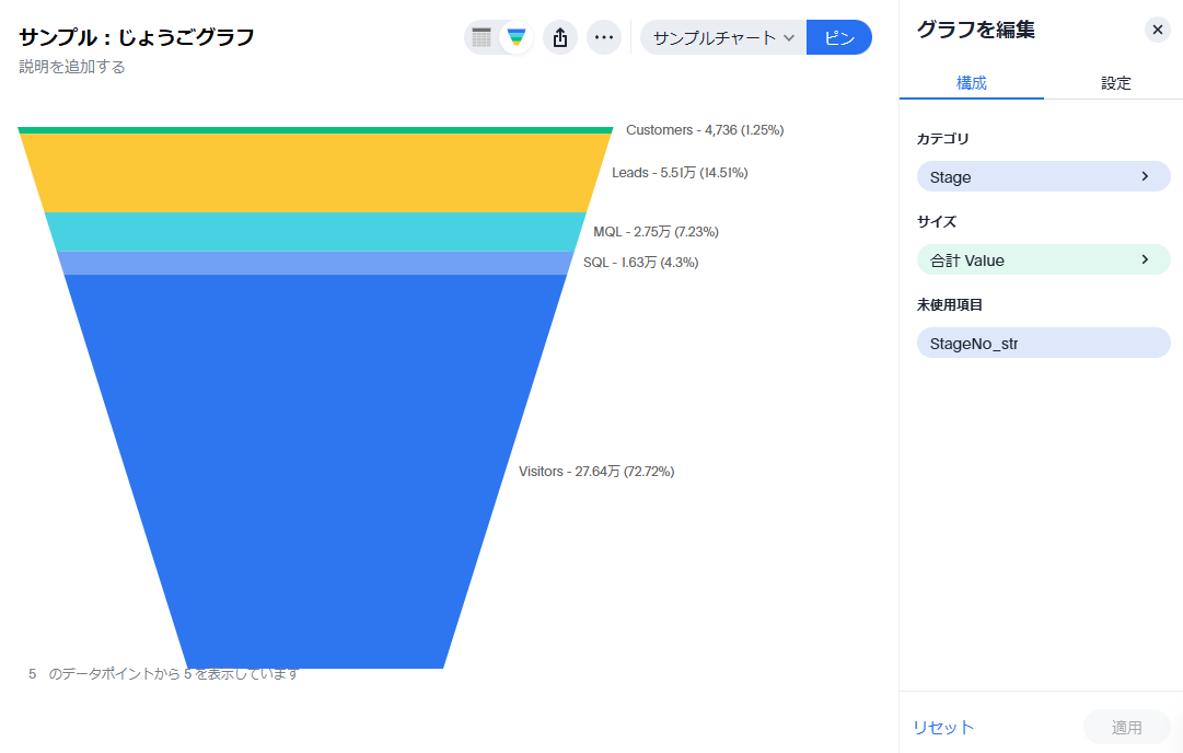 じょうごグラフ(ファネルチャート)は、データがいくつかの段階に別れており、各段階で減少していく前提のデータを表現するのに向いているグラフで、各項目は全体を100%にしたときの割合が計算されます。