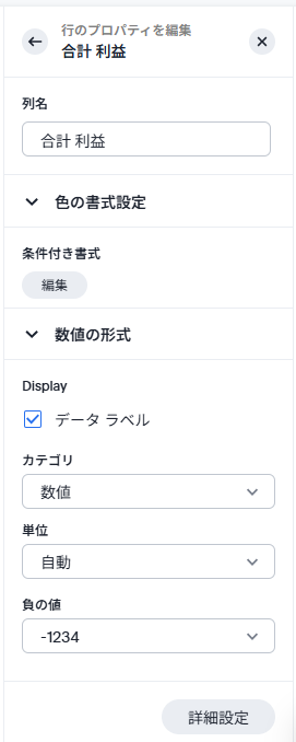 「Y軸の行のプロパティ」の設定は、列名の変更、データラベル、色の書式設定(条件付き書式)、数値の形式となります。X軸と異なりデータラベルの表示オプションがあります。