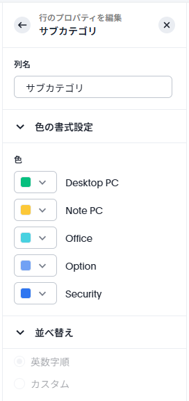 色付きスライスの「行プロパティ」の設定は、列名、色の書式設定、並べ替えとなります。