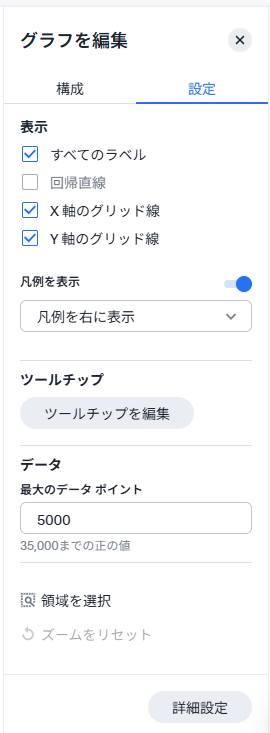 散布図のカスタマイズ項目は、「すべてのラベル」「X軸のグリッド線」「Y軸のグリッド線」「凡例を表示」「ツールチップ」「最大のデータポイント」となります。