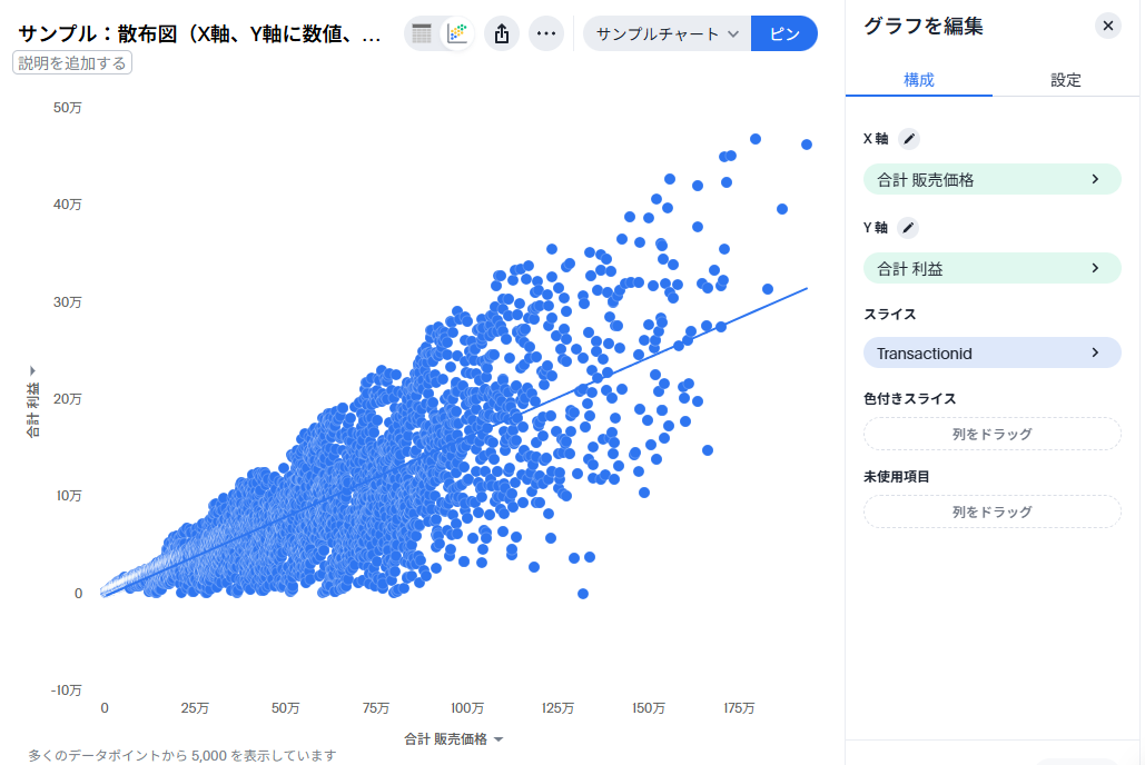 X軸、Y軸に数値を設定し、スライスはTransactionidを設定、回帰直線のチェックをいれると、以下のような回帰直線が表示されます。