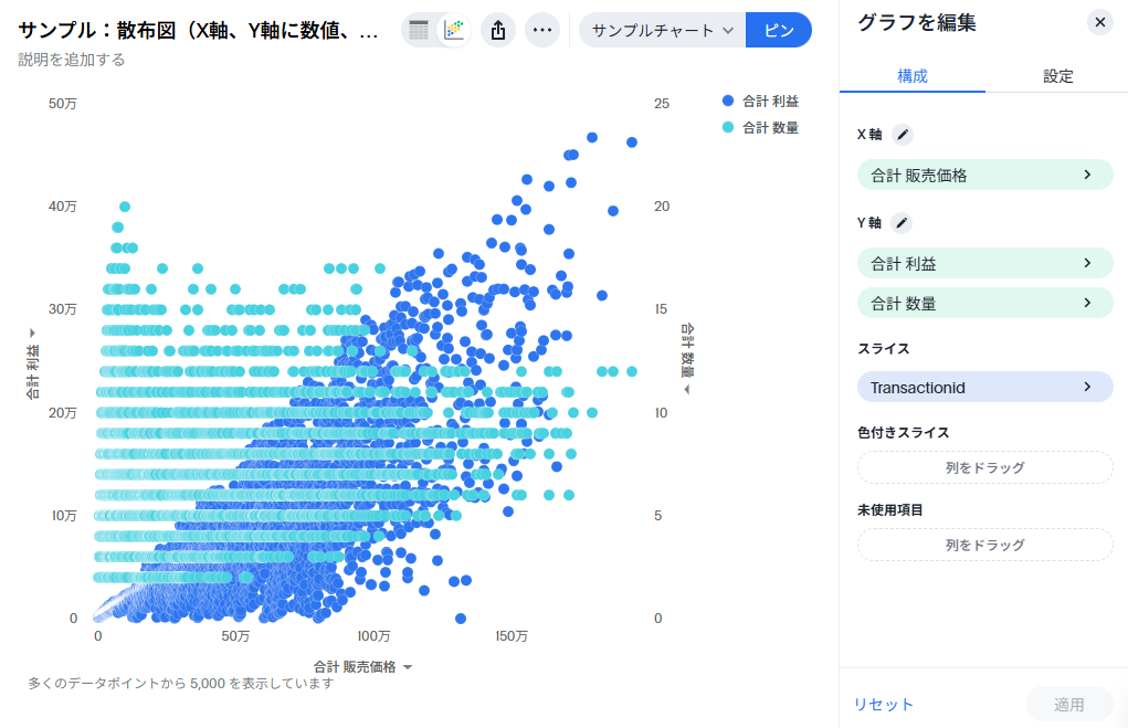 散布図は、2つの数値項目をX、Y軸上にプロットするようなグラフです。プロットする際に、各データポイントを分割するための属性の指定が必要です。