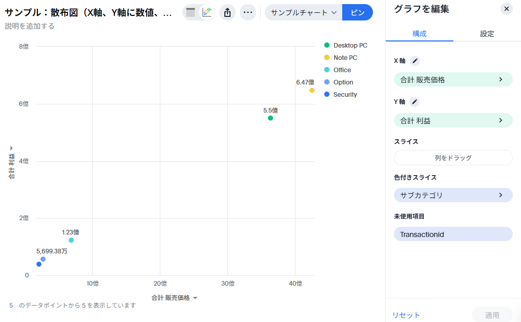 X軸、Y軸に数値、スライスに属性(特に今回はTransactionidなので、分割数が多くなります)、色付きスライスにサブカテゴリを設定した例です。