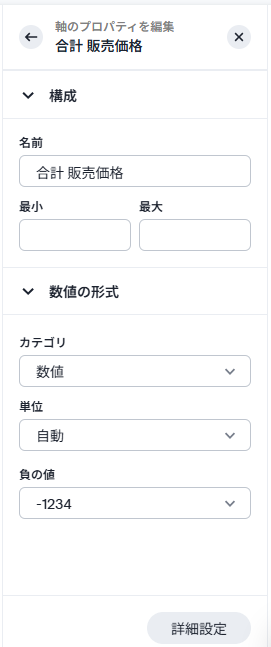 Y軸のプロパティの設定は、「軸の名前」、表示する範囲の「最大」「最小」、数値の形式(カテゴリ、単位、負の値)となります。