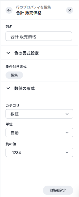 「X軸の行のプロパティ」の設定は、列名の変更、色の書式設定(条件付き書式)、数値の形式となります。
