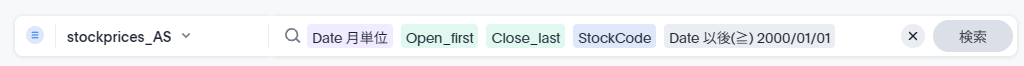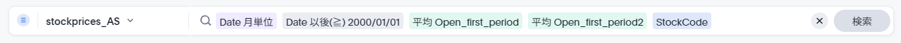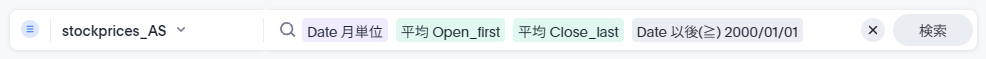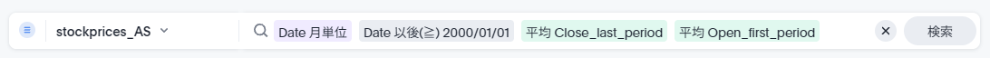 例えば、ここで1月の始値の平均を取りたいといった場合、1/4の6971.Tと1/3のAAPLの平均を取りたいとします(通貨が異なりますが、今回は無視しましょう。ここでは話を簡略化するために同じ通貨という前提で考えてください)。この場合、StockCodeを検索キーワードから抜き、先程の数式に「平均」キーワードを付加します。これにより以下のような検索キーワードとその結果を見ることができます。