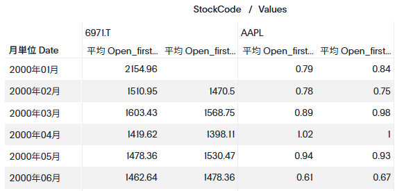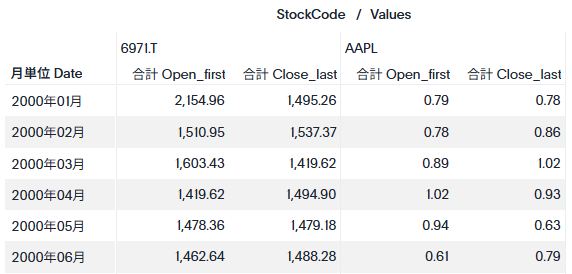 上の表から、1月のOpen_firstがうまく取れていないように思います。見た感じ、0.79という値が入っているためAAPLの1月3日分のみで平均を取った結果となっているようです。これは、StockCodeを無視して日付の中で一番古い日付のみを使って計算をしているからです。それでは、StockCodeごとに古い日付を取り、その平均を取るにはどうすれば良いのでしょうか?