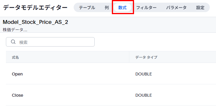 この場合、あくまでこの検索画面でのみ使える数式です。分析をする際、様々な数式を使うことがありますが、ワンショットの分析の際はこの画面で数式を作成することで、自分だけのものとして利用が可能です。一方で、始値、終値、といった項目は常に最初の値、最後の値を取るべきで、決して合計するものではないため、モデルに計算式を配置し、元々あった「始値」「終値」は各分析者に見せないのが望ましいです。つまり、分析者が誤って始値、終値を合計しない、ということが肝心です。