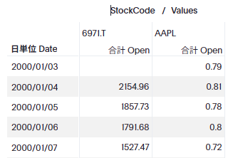 ところで、株式の市場が異なる場合、以下のように始まりの日が異なることがあります(例えば、以下の表で見ると、6971.Tは日本の市場で、AAPLはアメリカの市場なので株式のやり取りの開始日が異なり、2000/1/3の6971.Tは空白(データなし)となっています)。