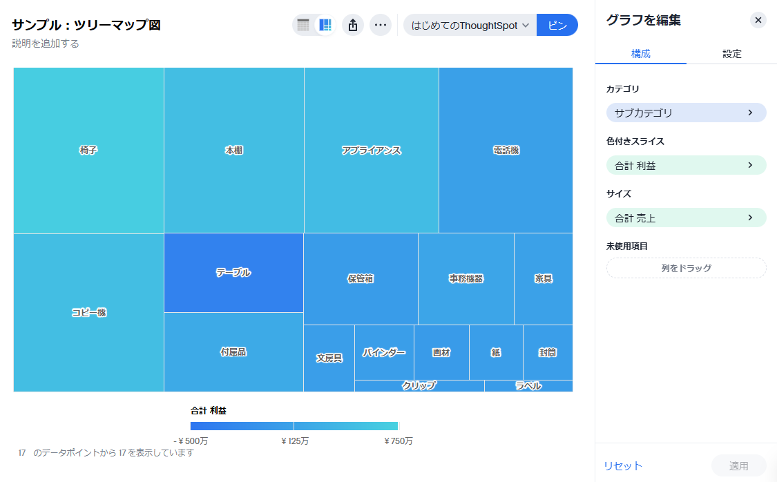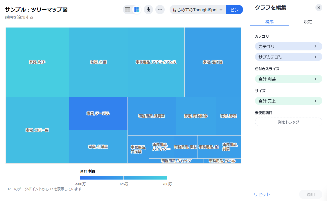 ツリーマップ図は、円グラフなどでは見にくいようなデータの可視化に向いています。ツリーマップ図についてはX軸、Y軸といった概念はなく、「カテゴリ」「色付きスライス」「サイズ」に対して設定を行っていく形になります。